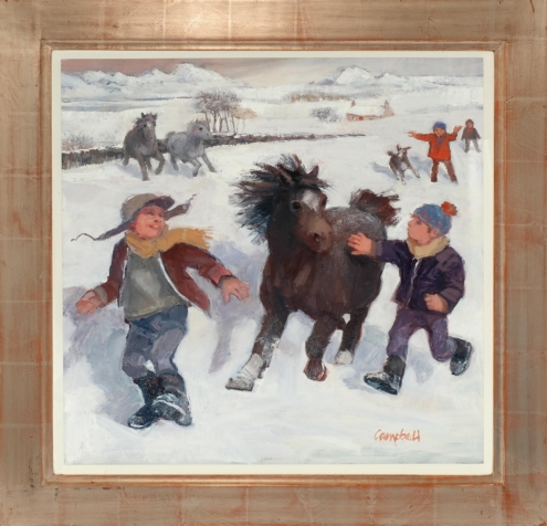 Scottish artist Catriona Campbell derives most of her inspiration from humans and animals, often using photographic evidence such as family photos or photos from newspapers for her “racing” pictures. She has great admiration for the 16th century painter, Pieter Bruegel and for Rogier van der Weyden. More recently she has also taken inspiration from the paintings of Degas, Stanley Spencer and Joan Eardley.
