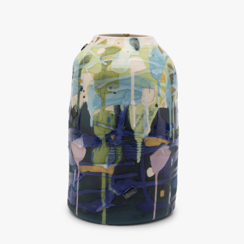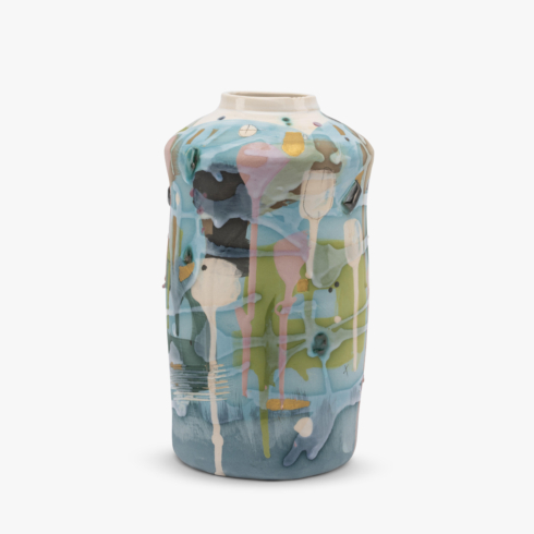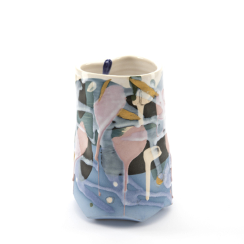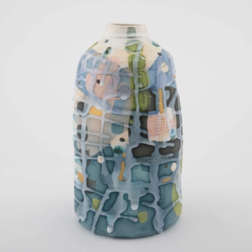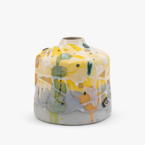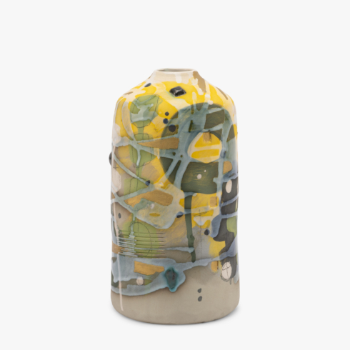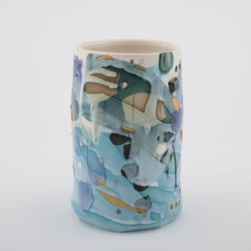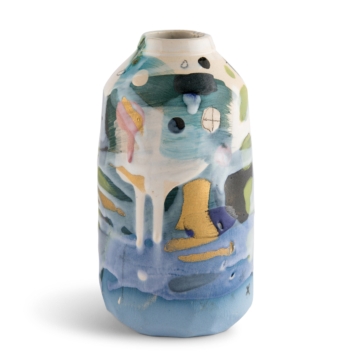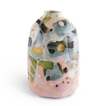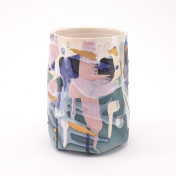 Each of her pieces is thrown in earthenware and decorated with abstract marks using a combination of slips, underglazes and oxides. Partially glazed and fired several times, Dawn also adds gilt to the surface. This references the ancient Japanese art of ‘Kintsugi’ in which a treasured ceramic, if broken, can be repaired using gold. She considers this to be a metaphor for our own lives. A reminder to stay hopeful when things fall apart and celebrate what we learn from our flaws and missteps.
