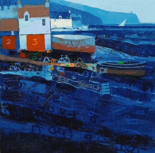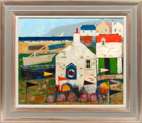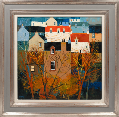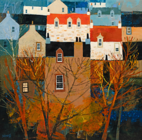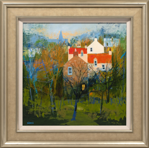 A graduate of Glasgow School of Art, George Birrell has enjoyed a long career in teaching. He now paints full time from his studio in East Lothian. When he was 15 George visited the villages of the East Neuk of Fife and he’s been fascinated by them ever since. These are villages with such a unique character, and one that contrasts strongly with some of the more dramatic and wild subjects of Scottish landscape paintings. George’s paintings are never of specific villages. However, they pull together the many elements – the architecture, alleyways, harbours and fishing creels – that are quintessentially East Neuk. George writes: