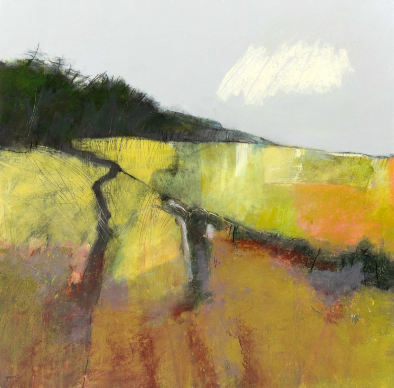 Always beginning with drawing, Georgie’s paintings are a product of observation, interpretation and improvisation. She works primarily in acrylic using a bold palette and building layer upon rich, textural layer, working into each one with a variety of tools. Working in this way allows Georgie to fully explore the interplay of light, time, weather and season on the everyday landscape, inviting the viewer to appreciate the unexpected beauty of unremarked places.