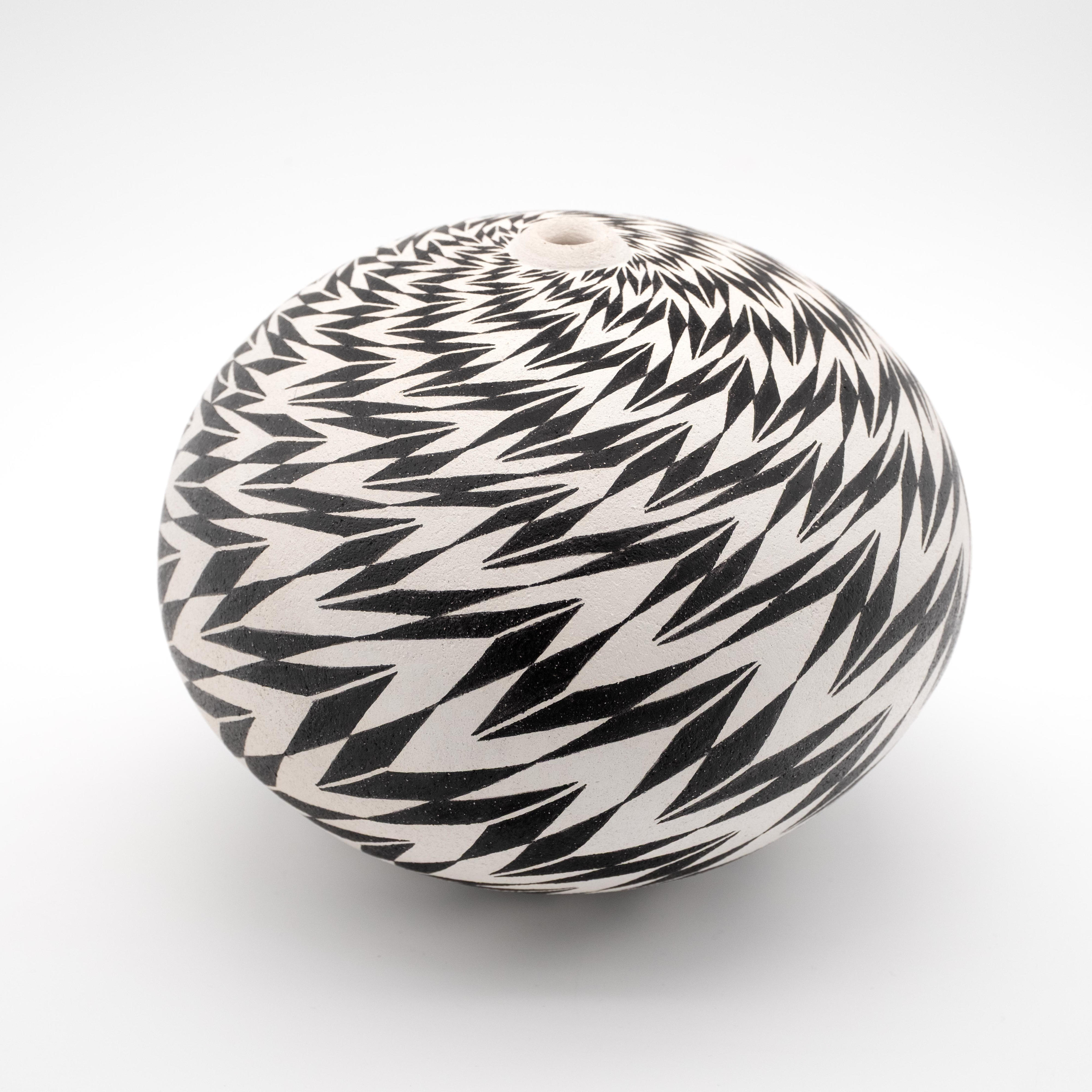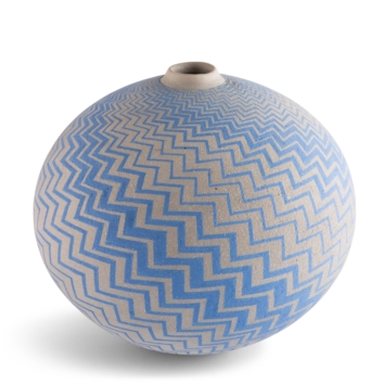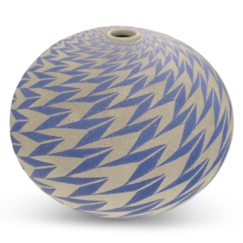 Ilona’s intricate geometric repeating patterns are painted onto the vessels with dry copper glaze, before being raku fired. The raku process allows her to be very close to the firing process. Once heated to 1000 degrees, the vases are transferred from the kiln with tongs to a bin of sawdust which burns and causes a chemical reaction with the glaze.