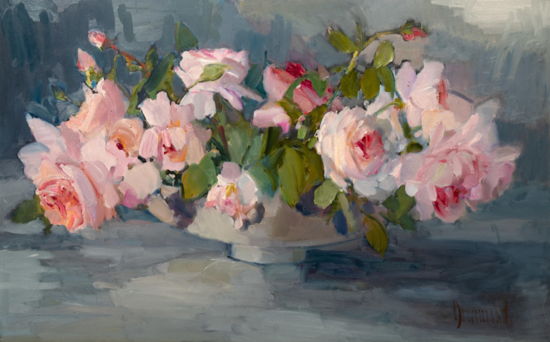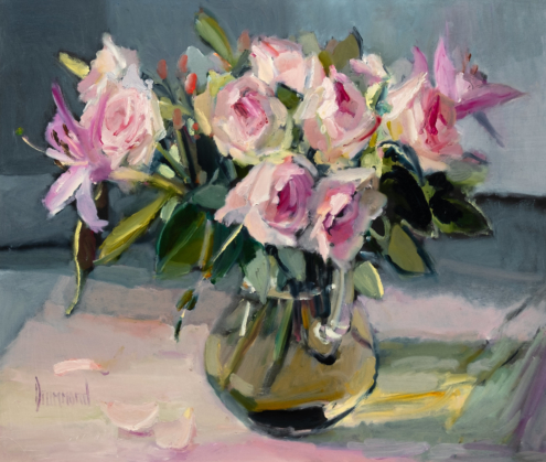 Taking her inspiration from the folds in petals or fabric to the translucent shimmer of a water filled vase, Marion dynamically captures the moment and portrays it with a level of passion and urgency. She completely immerses herself in the visceral act of painting.