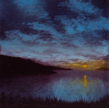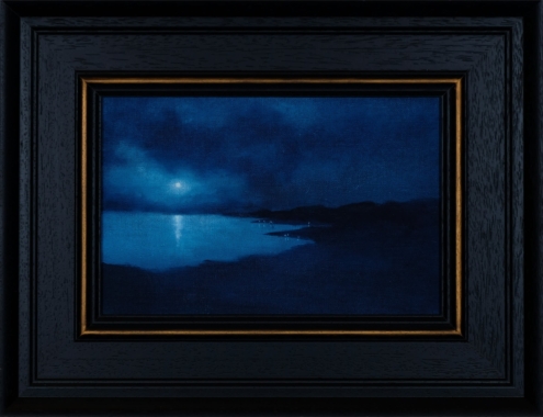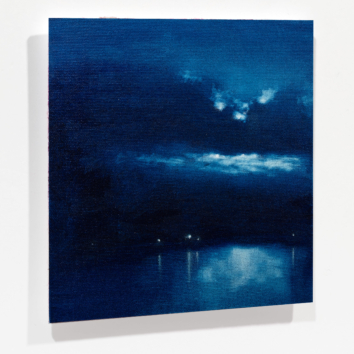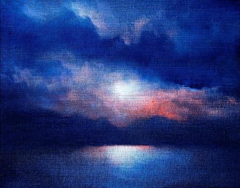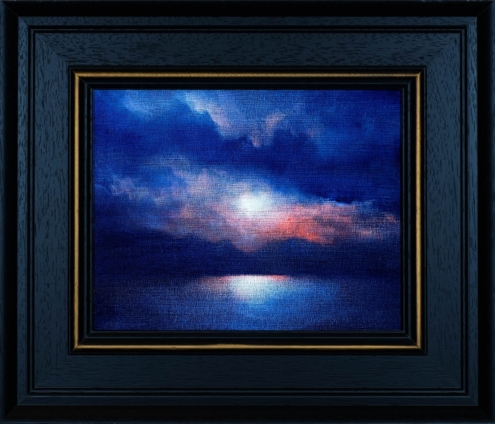 Light and specifically its interaction with clouds, water and architecture is what inspires Michael. Working in oil and starting with an almost black canvas, he gradually teases out images, removing darkness and illuminating the scene.