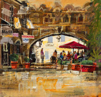 Mike is inspired by his Devonshire surroundings but also by his travels all over the UK and Europe. He has said that what attracts him most is the pattern of buildings, boats and similar features within a scene.