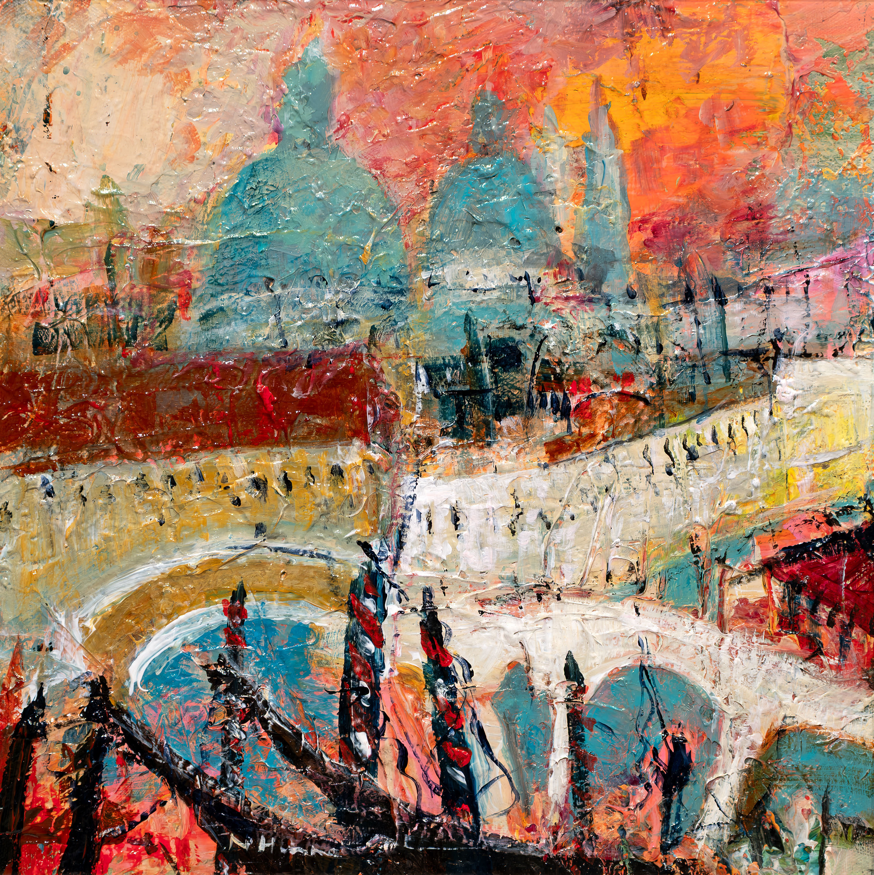 A string of prizes and awards followed, including one from Royal Scottish Academy (RSA) to travel to and study in Florence. After his return Nael completed an MPhil in Art, and went on to lecture in its Fine Art department. Since then, Nael has painted full time, exhibiting throughout the UK and collected worldwide. His distinctive style of painting is instantly recognisable but pays homage to many of his favourite artists. An ecumenical gathering – Willem de Kooning, Marc Chagall and Joan Eardley. Read more here.