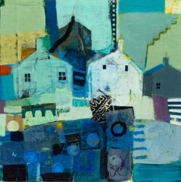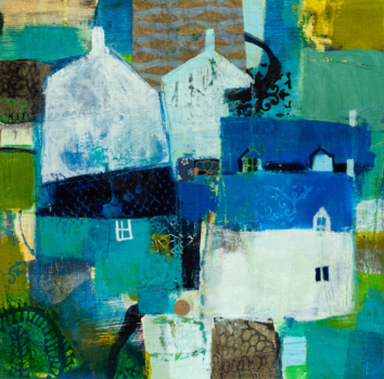 Nicole spends a great deal of time in the places she finds interesting. She produces small watercolour and ink paintings, sketches and photographs for reference. She then works in the studio on heavy, stretched watercolour paper, building up layers of watercolour, collage, acrylic and inks. Her paintings are constructed in a way that imply dimensionality, as ambient light moves over the surface of each piece the eye can discover different motifs and design elements, drawing the viewer deeper into the composition and immersing them in the atmosphere of a specific location.