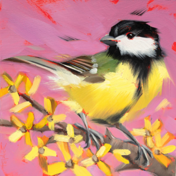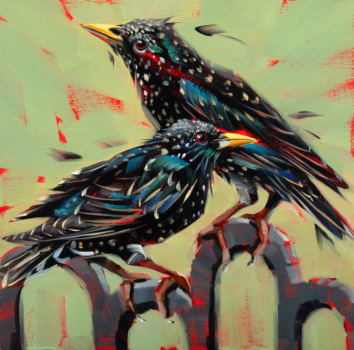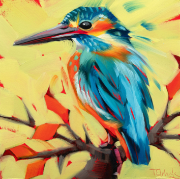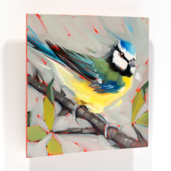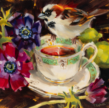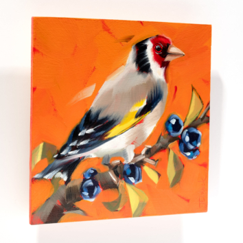 Tracey’s playful still life compositions combine garden birds with patterned crockery, fruit and flowers. She uses a range of media to capture a sense of harmony and movement. She combines her loose, dynamic brushwork with backgrounds of layered colour and collage, to imbue her subjects with a lively energy.
