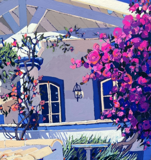 In the main group of Provencal paintings Jennifer conveys a real feeling of the heat of the sun soaking into the buildings, with its shimmering light and luminous shadows. There is a similar feeling with the Portuguese work but there she concentrates more on the intense colour afforded by the bountiful bougainvillea and mimosa and the beautiful shadows that they create in the heat of the day. On Tiree it is the very distinctive light there that fascinates Jennifer. Even on a day of leaden sky there is an amazing pale, transparent, translucent turquoise light that is completely captivating and again just as much of a challenge to capture.